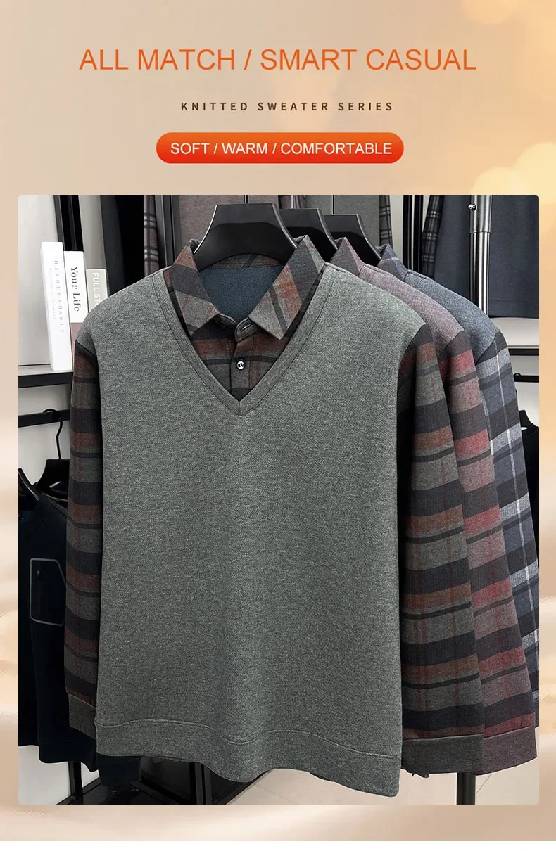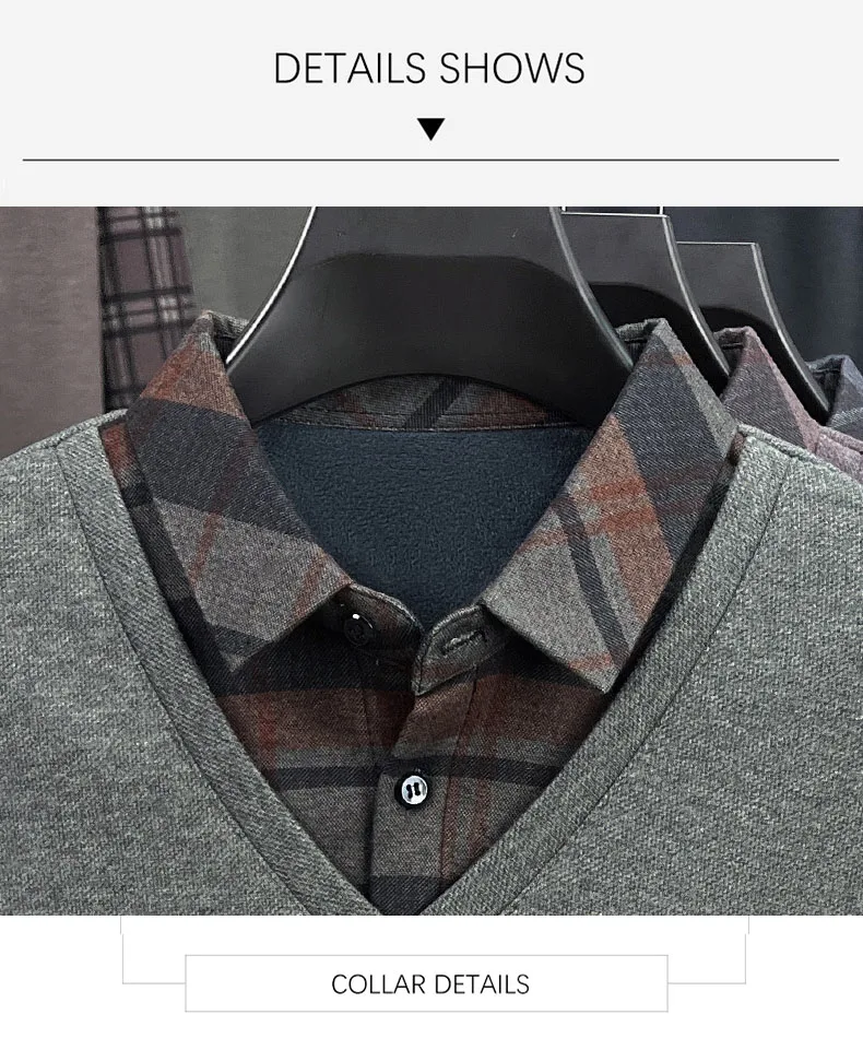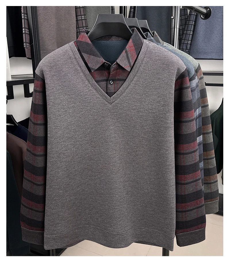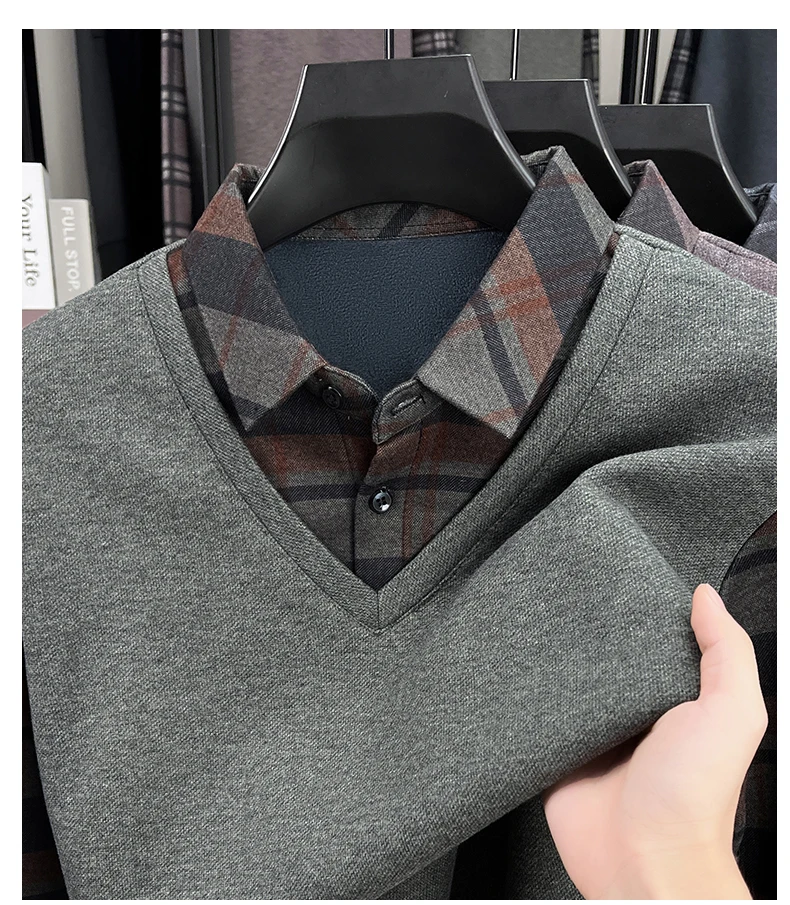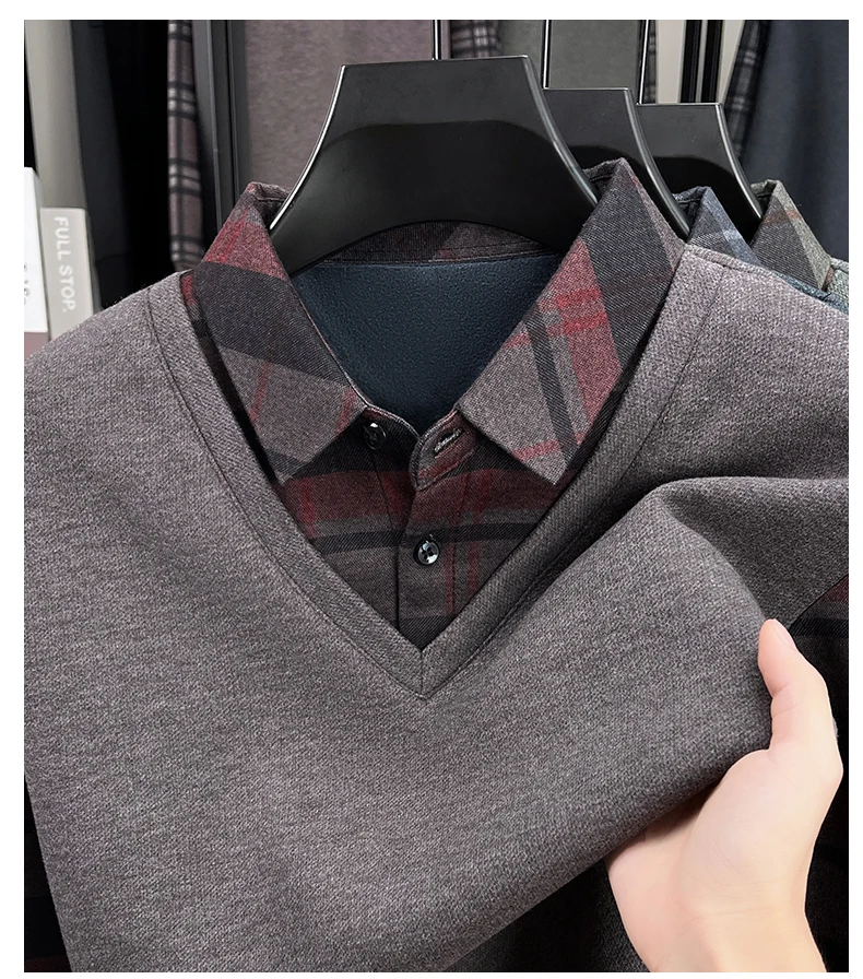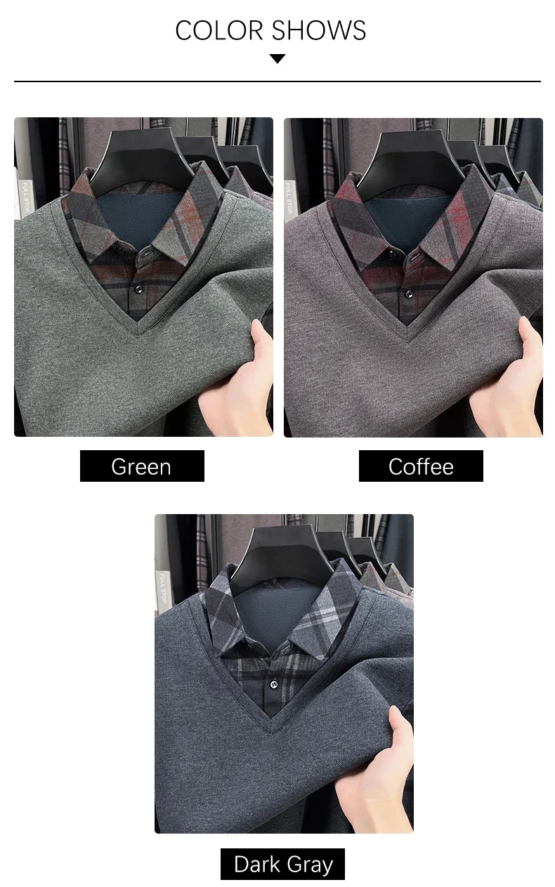 BROWON 2025 Elegant Winter T-shirt Men Thick Fleece Long Sleeve Turn Down Collar Fake Layered T-shirt Man Oversized Dad Clothes